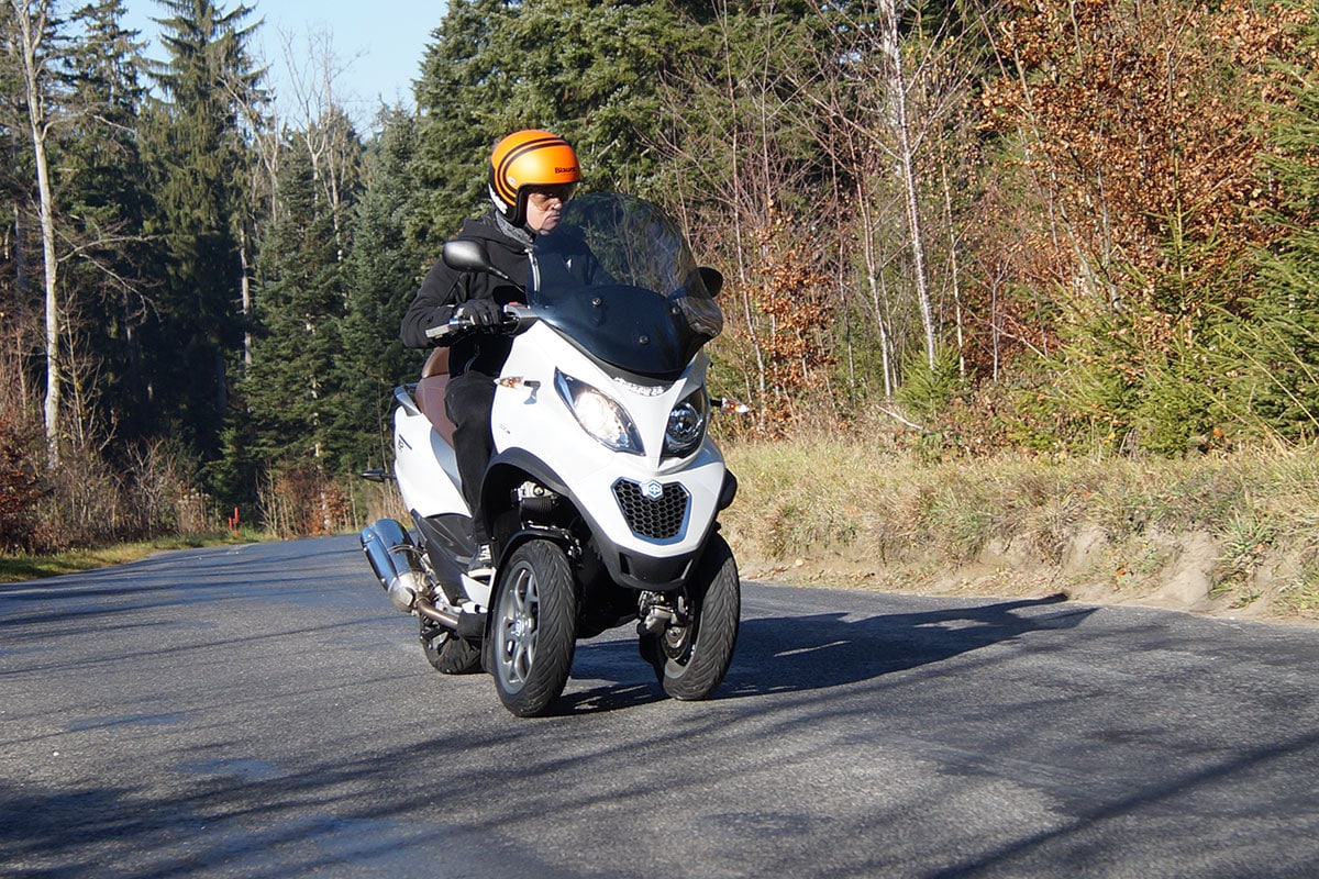 Que dit un conducteur à quatre roues incliné à un conducteur à trois roues incliné lorsqu’il tombe sur lui au bord du lac ? Quelque chose comme : « J’en ai un de plus que toi » ? Nous avons mis à l’épreuve deux modèles récents de multiroues inclinables vendus en Suisse, avec d’un côté la référence du marché, la Piaggio MP3 500 (c’est celle à trois), et de l’autre un challenger d’origine suisse, la Quadro Quattro (ou plus simplement « 4′, pas besoin de préciser le nombre de roues). Cette petite comparaison montre des caractères très différents, même si les deux scooters ont en commun l’idée d’offrir plus de stabilité (et donc de sécurité) à leur guidon que celui d’un deux-roues conventionnel.